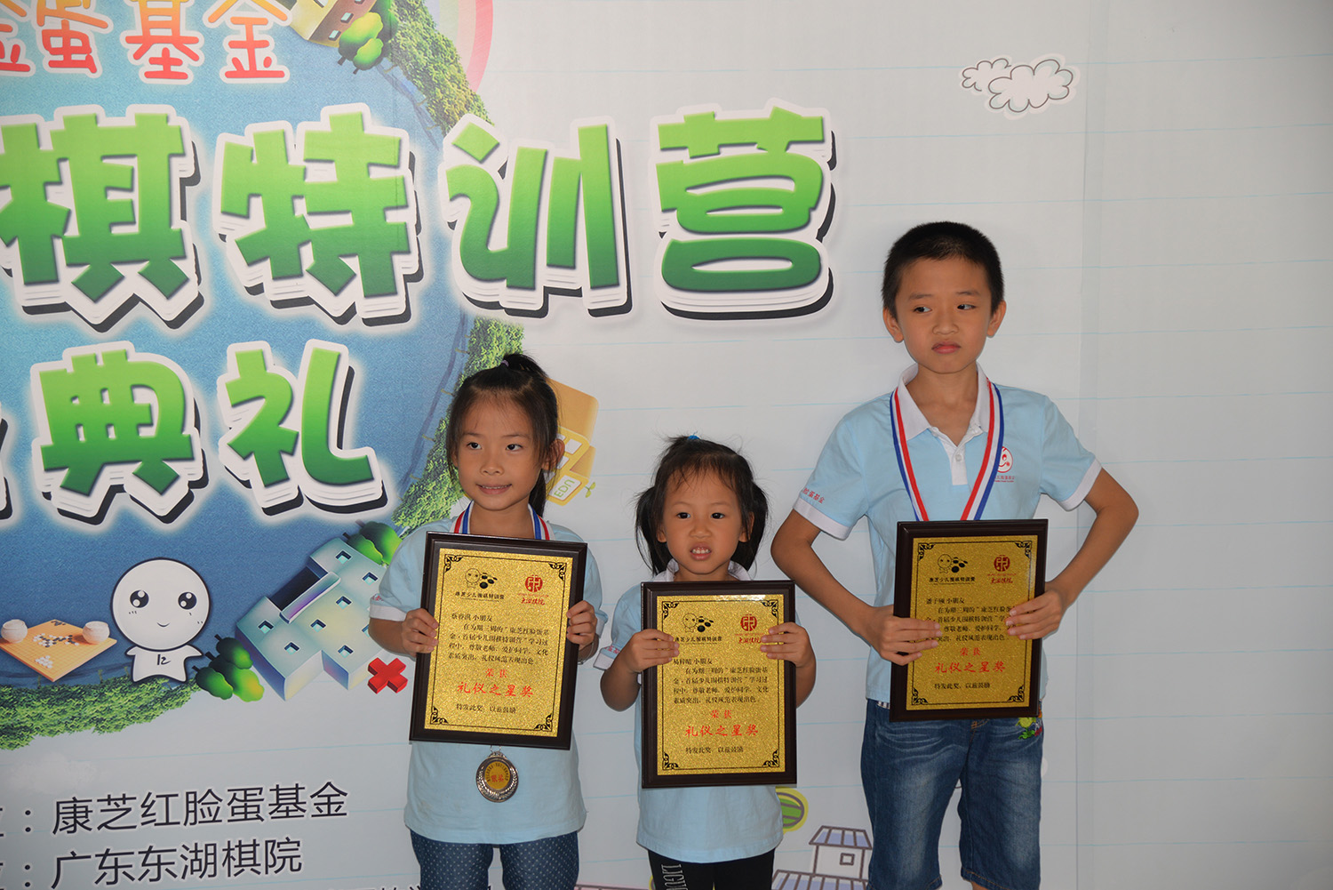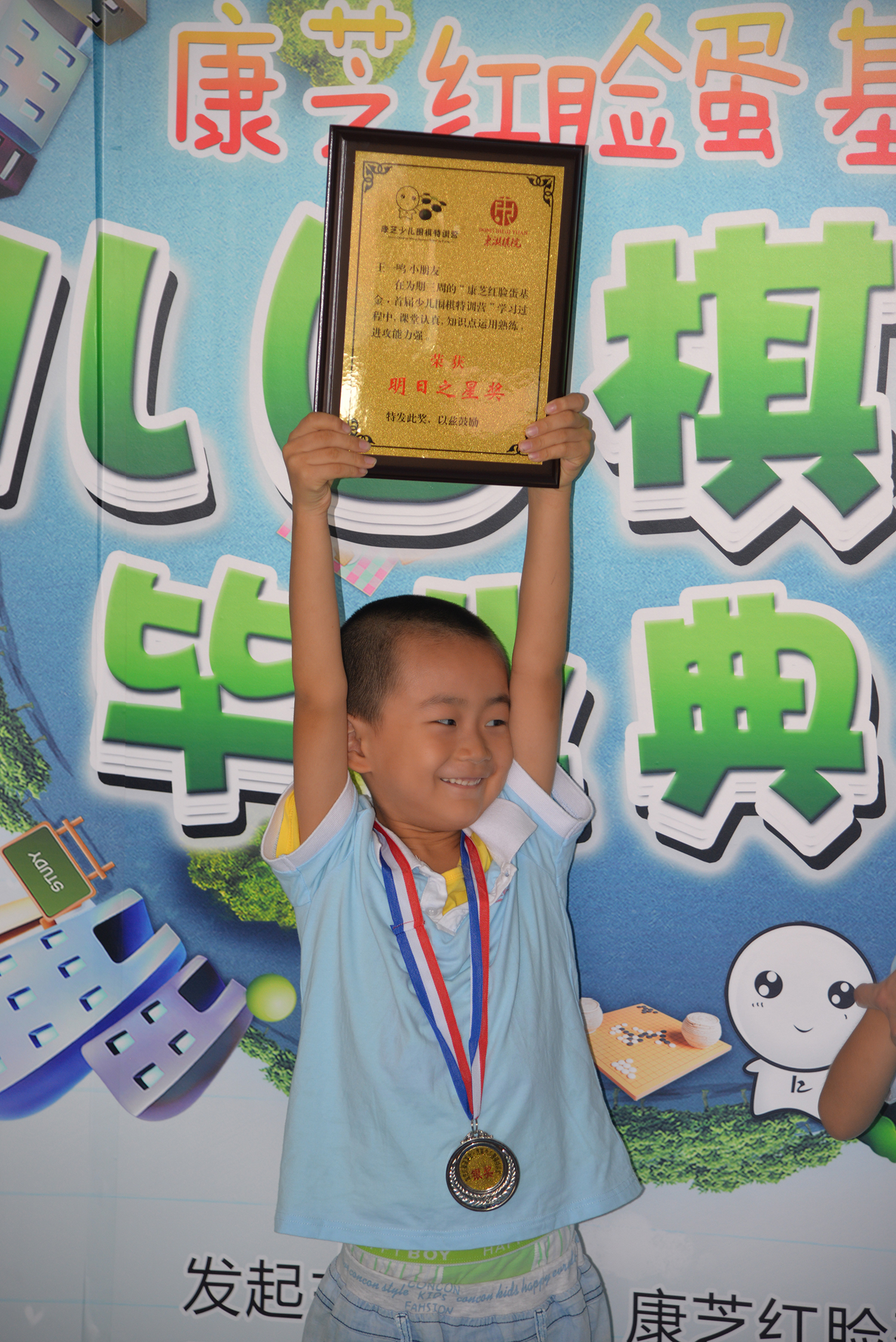 当天的对弈积分赛中,小学员们初露头角。对弈过程遵守围棋礼仪,举棋落子间运筹帷幄,已颇有小棋手风范。综合两轮对弈赛的积分,最终排名前十位的小学员分别获得了金、银、铜牌。根据孩子们三周以来的表现,特训营还评选出了“礼仪之星”、“飞跃之星”和“明日之星”各四名,现场由嘉宾为获奖学员颁发荣誉奖牌。