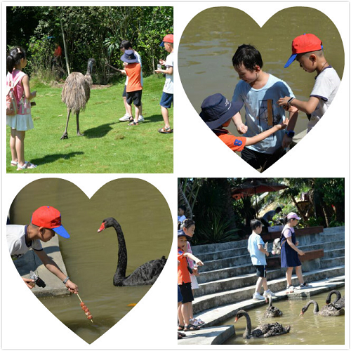 午餐后,大家集体前往南沙水鸟世界。在了解水鸟的形态与生活之余,孩子们还在专人指导下与各色各样的水鸟展开了亲密“交流”。孩子们或手持草料近距离喂食与他们一般高的鸵鸟;或停下匆忙的脚步,闭着眼聆听湖畔天鹅的鸣叫;抑或伸出手、探出头,用触觉和嗅觉代替眼睛来感知面前的小孔雀。