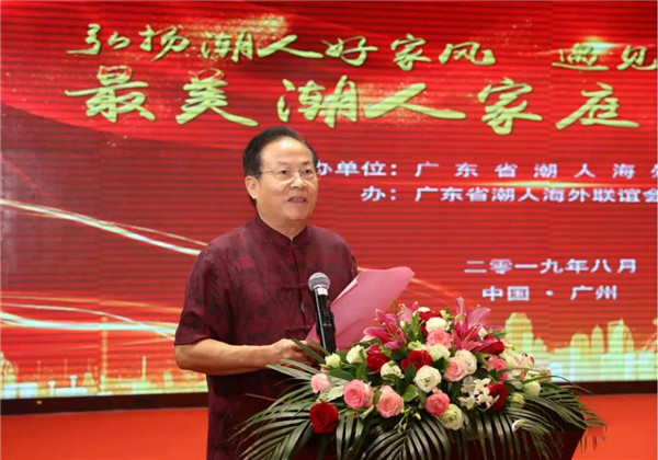 蔡东士会长在表彰大会上致辞。首先,他对获奖家庭表示热烈祝贺。他说,我们隆重举行广东省潮人海外联谊会“十大最美潮人家庭”和“最美潮人家庭”表彰大会,这是贯彻落实习近平总书记关于重视家庭家风建设有关论述的重要举措。省潮联自成立以来一直十分重视宣传中华优秀传统文化,弘扬潮汕地区优良家风。今年是新中国成立七十周年,70年来所取得的辉煌成就令人鼓舞,正因为有祖国的繁荣富强,才有我们的幸福生活。我们举办这次表彰活动,就是希望弘扬家国情怀,发挥榜样的力量,凝心聚力,以一带十,以十带千,引导更多潮籍家庭积极践行社会主义核心价值观,传承中华民族的好家风,树立文明家庭榜样,传递“好家庭、好家教、好家风”正能量,为实现中华民族伟大复兴中国梦做出贡献,共同创造更加幸福美好的明天。