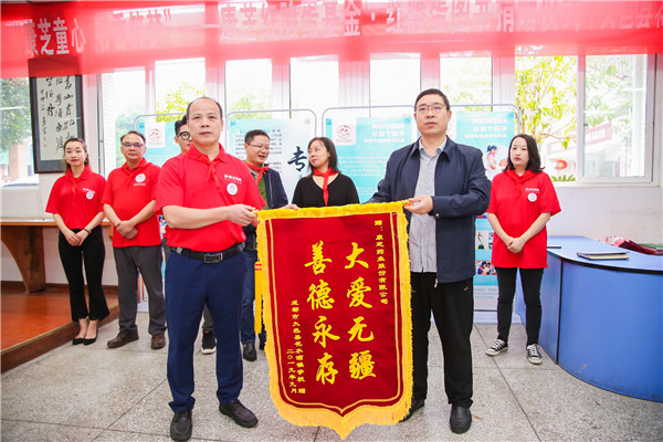 为鼓励孩子们多读书、读好书,龙殿康先生向花水湾小学校长何平赠送了“爱心共建学校”牌匾。接着,花水湾镇学校校长幸贵明代表学校给yl23455永利集团赠送了“大爱无疆 善德永存”的锦旗。