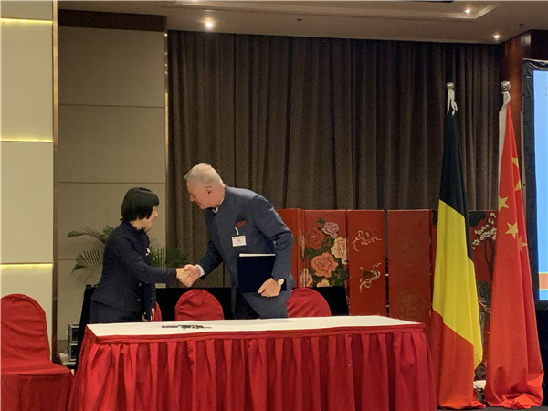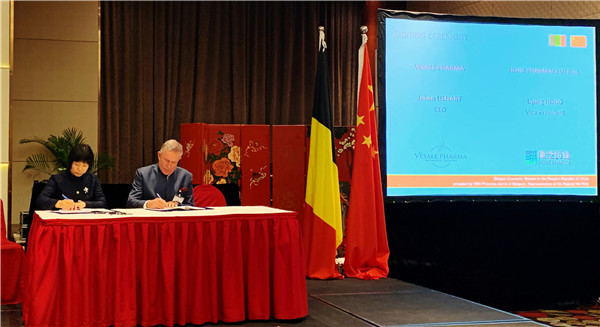 △yl23455永利集团副董事长兼副总裁洪丽萍(左)与Vésale Pharma公司董事长Jehan Lienart(右)签署协议