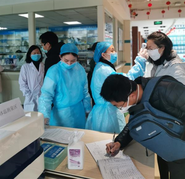 医院严格按照疫情防控要求,将员工通道与患者通道分开,患者从门诊大厅进入医院,而医护人员从侧门进入医院,不管是正门还是侧门,都设立了发热预检点。医护人员24小时值班,严防死守,不漏一人,对进入医院的患者及家属,医护人员、后勤人员等在内的所有人员进体温测量,及时识别可疑病例,做到“早发现、早报告、早隔离、早治疗”。