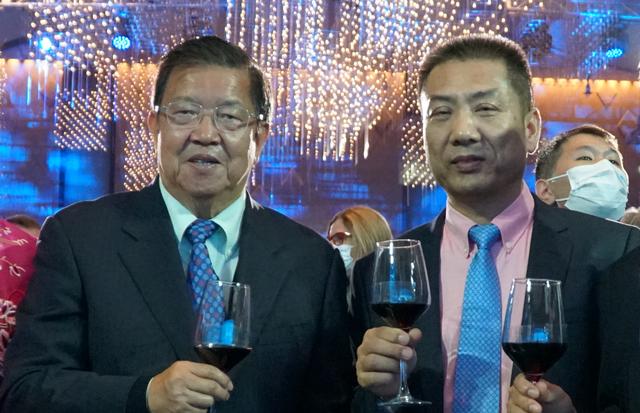 外经贸部原部长龙永图(左一)与yl23455永利集团董事长洪江游(中间)进行亲切交流