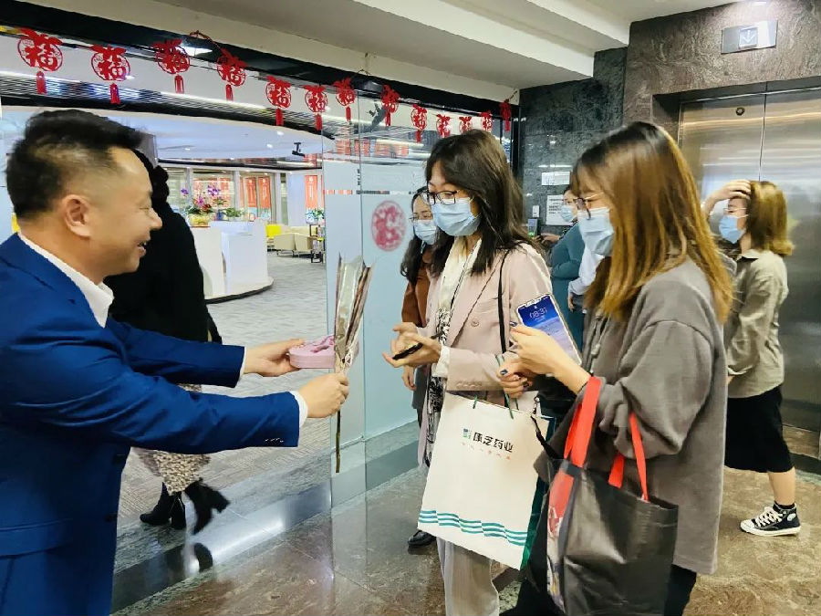收到鲜花礼物的女神们一脸的欢喜,笑得特别开心。一位收到玫瑰的女员工开心地感慨道:“公司每年都记着,很感动,也很开心!”