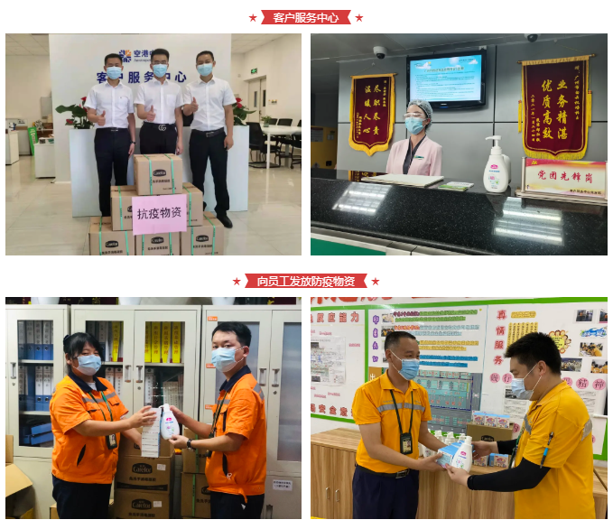 爱护消毒凝胶物资分别投入至机场问讯处、防爆点、物流点、机场餐厅等,以便流动人群随时清洁消毒使用。同时也向内部员工、志愿者和附近酒店统一发放了防疫物资。