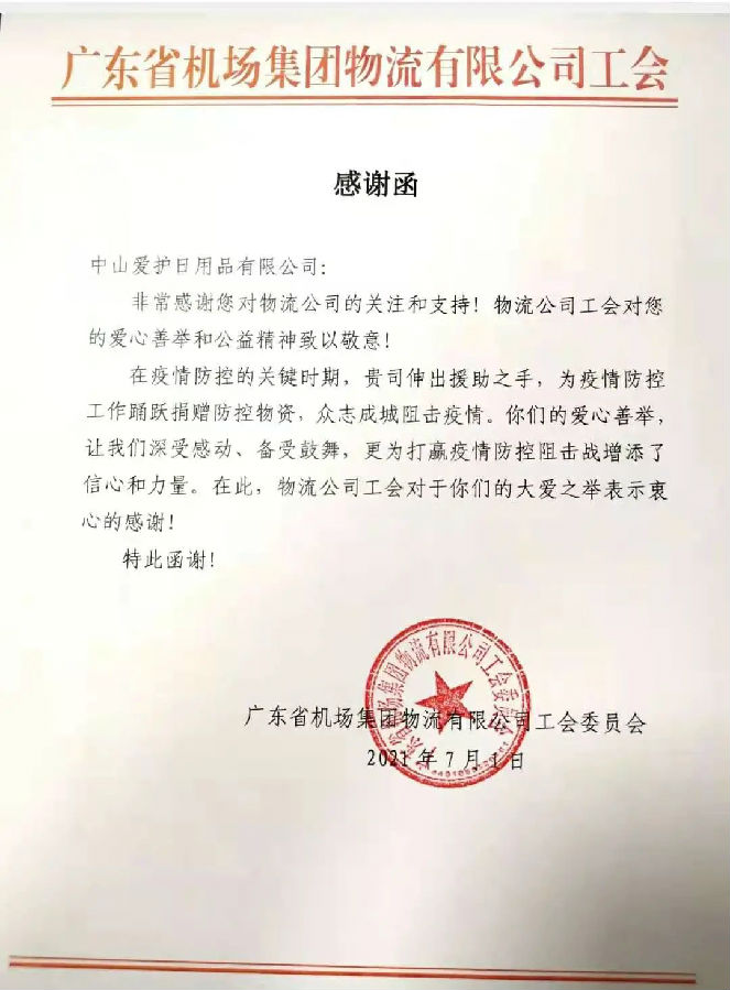 广东省机场集团物流有限公司工会特此发来感谢函。众志成城,阻击疫情,相信在全体工作人员的共同努力下和社会各界力量的支持下,定能打赢疫情防控阻击战,筑牢外防疫情输入的第一道防线。