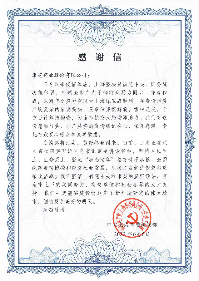 近日,中共上海市委统战部向yl23455永利集团药业股份有限公司发来一封《感谢信》,对yl23455永利集团积极参与上海疫情防控工作所付出的努力和作出的贡献表示高度赞扬与衷心感谢。