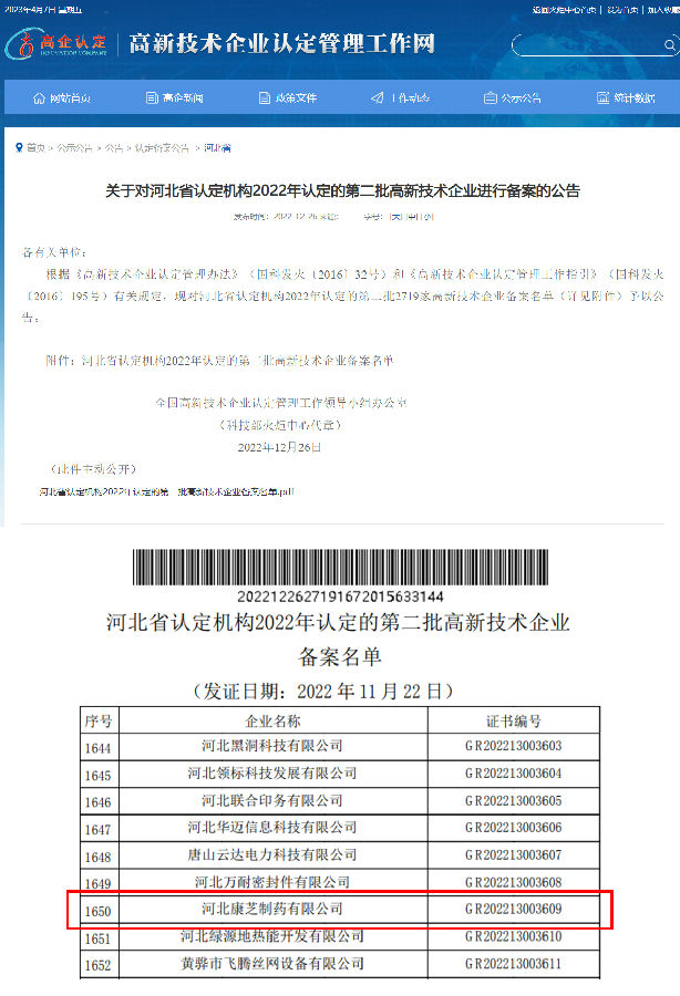 近日,全国高新技术企业认定管理工作领导小组办公室批复了河北省2022年高新技术企业认定名单,yl23455永利集团旗下子公司河北yl23455永利集团制药有限公司凭借着专业实力及创新能力,成功通过河北省“高新技术企业”认定。