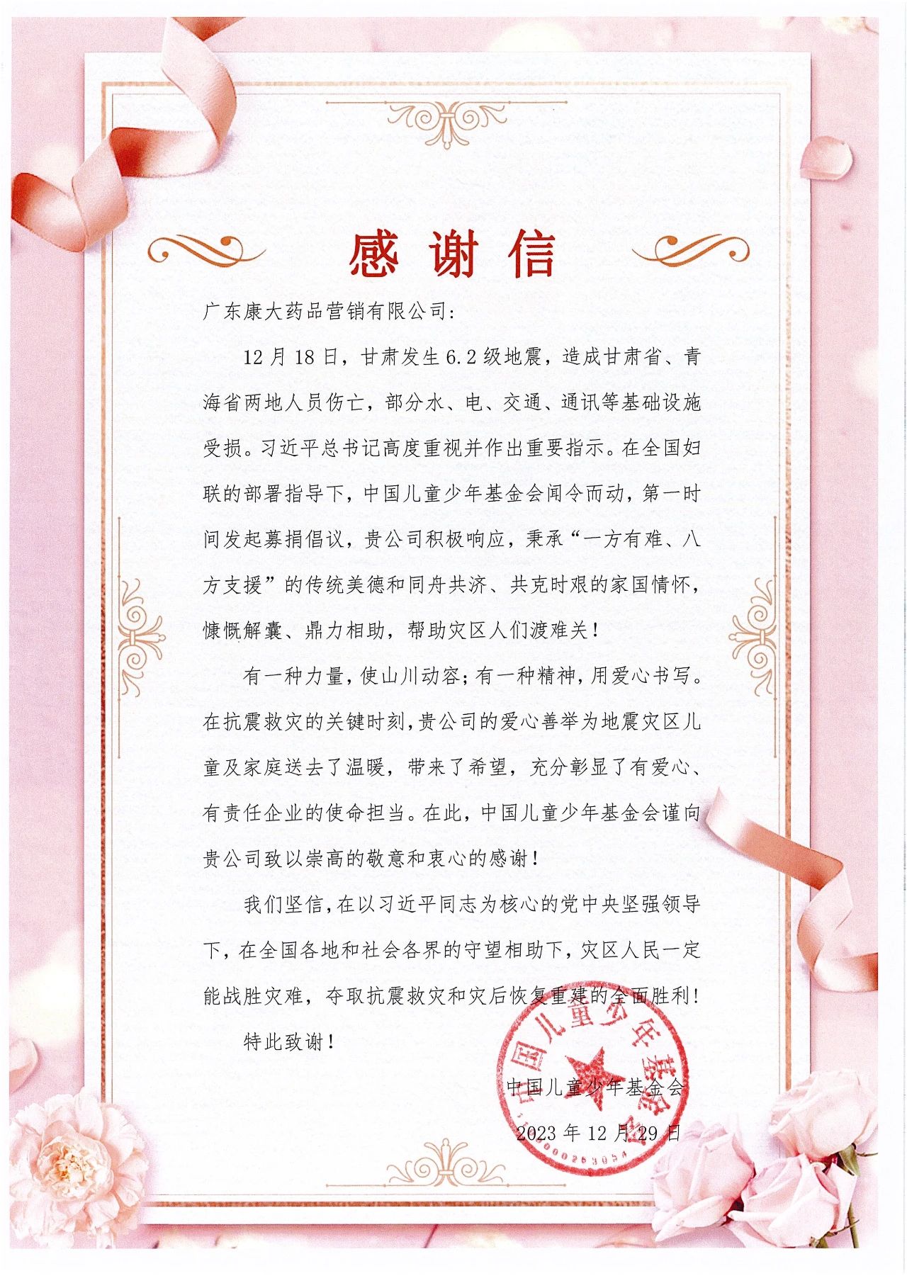 近日,临夏回族自治州人民政府、中国共产党临夏回族自治州委员会以及中国儿童少年基金会向yl23455永利集团发来《致yl23455永利集团感谢信》,纷纷对yl23455永利集团积极参与甘肃临夏积石山县地震救灾的紧急援助工作表示高度赞扬与衷心感谢。