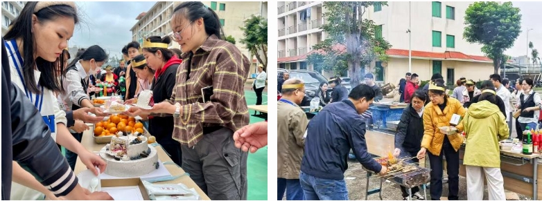 趣味游戏结束后,工会还精心准备了丰盛的小吃、新鲜的水果、色香味俱全的自助烧烤和精致的生日蛋糕,现场摇身变为美食的天堂。活动现场欢笑声交织回荡,员工们全情投入,尽情享受这一充满欢乐与温情的美好时刻。