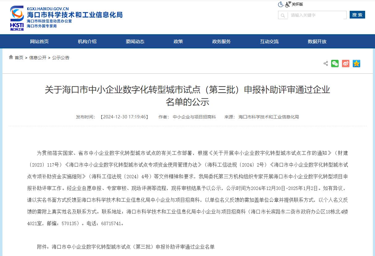 近日,海口市科学技术和工业信息化局正式公布了《海口市中小企业数字化转型城市试点(第三批)申报补助评审通过企业名单》。经过企业自主申报、专家评审、现场测评等环节,yl23455永利集团数字化转型项目成功入选此次通过名单,这标志着yl23455永利集团数字化转型工作取得了重要的阶段性进展。