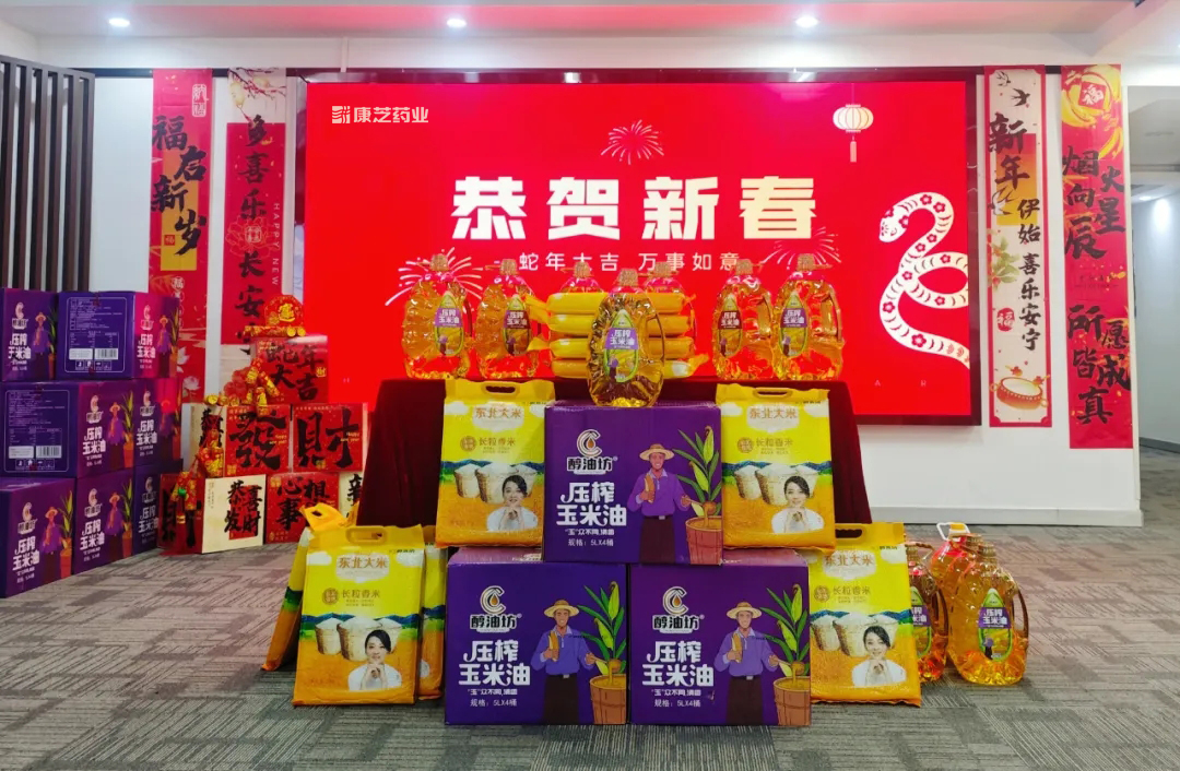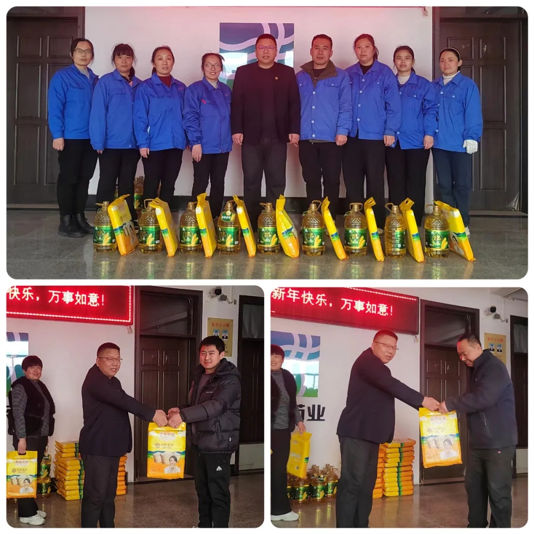 河北生产基地总经理杨玉乔把一份份年货逐一发放到每一位员工手中,同时殷切地向员工及家属送上真挚的问候和美好的祝福。