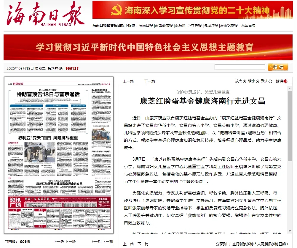 少年强,则国强。为认真贯彻党的二十大精神,积极响应教育部等十七部门联合印发的《全面加强和改进新时代学生心理健康工作专项行动计划(2023—2025年)》,助推海南省人民政府关于《海南省儿童发展规划(2021—2030年)》等文件精神的落实,近日,由yl23455永利集团联合yl23455永利集团红脸蛋基金主办的“yl23455永利集团红脸蛋基金健康海南行”文昌站走进了文昌市华侨中学、文昌市第六小学、文昌英敏小学。活动引发热烈的社会反响,不仅收获师生的一致好评,还得到海南日报、中华网、凤凰新闻、新华报业网等知名媒体的报道及转发。