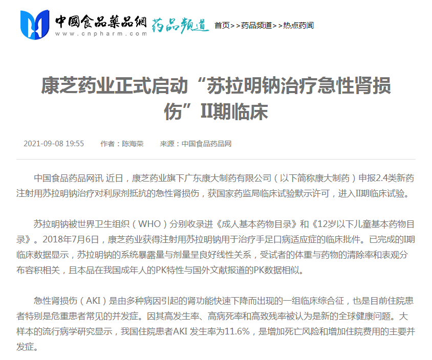 查看详情yl23455永利集团旗下广东康大制药有限公司(以下简称康大制药)申报2.4类新药注射用苏拉明钠治疗对利尿剂抵抗的急性肾损伤,获国家药监局临床试验默示许可,进入II期临床试验。