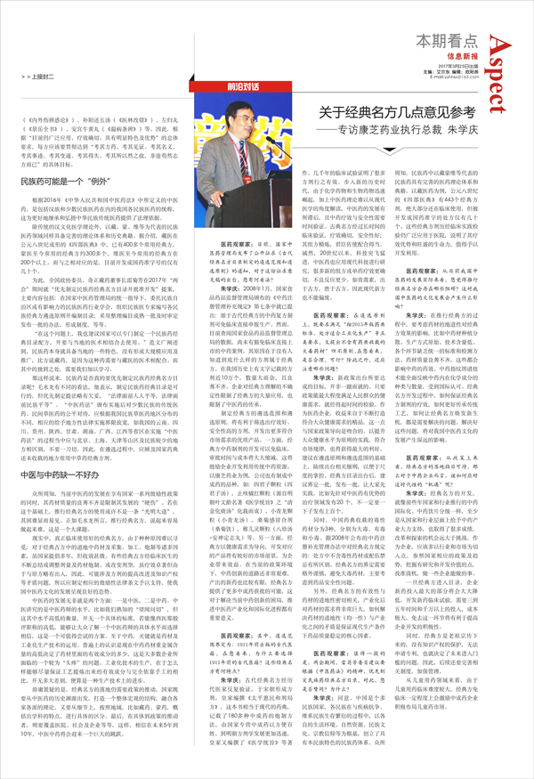 朱学庆:在推行经典方的过程中,要考虑药材的地道性对经典方效果的影响,比如中药材种植分散、生产方式原始、技术含量低、各个环节缺乏统一的标准和检测方法、药材质量良莠不齐,这些都会影响中药的药效。中药指纹图谱技术能全面反映中药内在化学成分的种类与数量,受到国际认可。经典名方开发过程中,如何保证经典名方制剂的疗效,如何更好传承传统工艺,如何让经典名方焕发新生机,都是需要解决的问题。解决好这些问题,将对我国中医药文化的发展产生深远的影响。